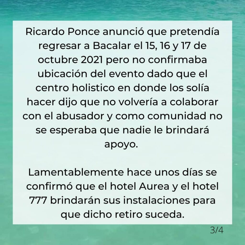 Y es que pese a todos los señalamientos respecto a que Ricardo Ponce creó una sexta sexual alrededor de sus cursos de “autosanación”, y aunque el hotel donde hacía sus retiros en Bacalar ya no le brindó más apoyo, denuncian que otro espacio sí le facilitó las instalaciones.