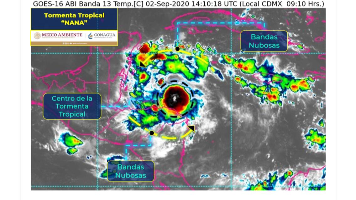 El Huracán “NANA” categoría UNO de la escala Saffir-Simpson, al tocar tierra se degrado a Tormenta Tropical “NANA”, la cual se ubica aproximadamente a 110 kilómetros al sureste de la Ciudad de Belice, y aproximadamente a 205 kilómetros al sur-sureste de Ciudad del Carmen, Campeche, presenta movimiento al oeste con vientos máximos cerca del centro de 110 kilómetros por hora con rachas mayores.