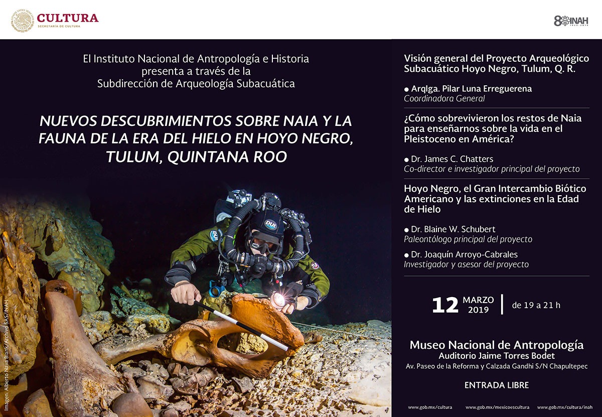 Ciudad de México.- Será este martes 12 de marzo, cuando el Instituto Nacional de Antropología e Historia (INAH) realice las conferencias, “Nuevos descubrimientos sobre ‘Naia’ y la fauna de la era del hielo en hoyo negro de Tulum”, a las 7 de la noche en el Auditorio “Jaime Torres Bodet” del Museo Nacional de Antropología en esta ciudad.