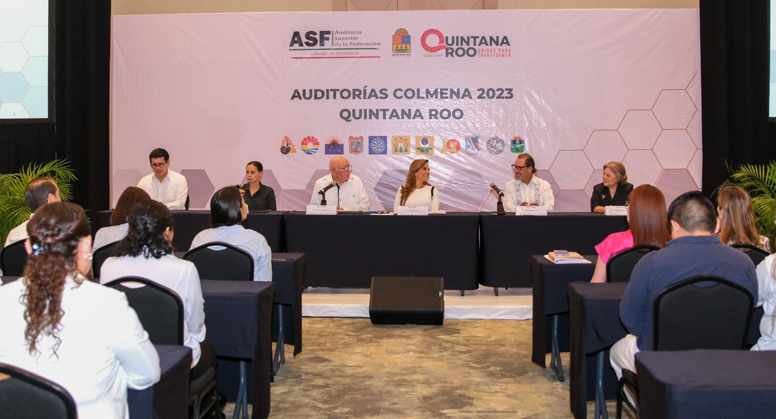 Cancún.- La gobernadora del estado, Mara Lezama Espinosa participó en la firma de las actas para que en los 11 ayuntamientos inicien las Auditorías de Colmena y que los recursos públicos sean administrados con honestidad, eficiencia y transparencia.