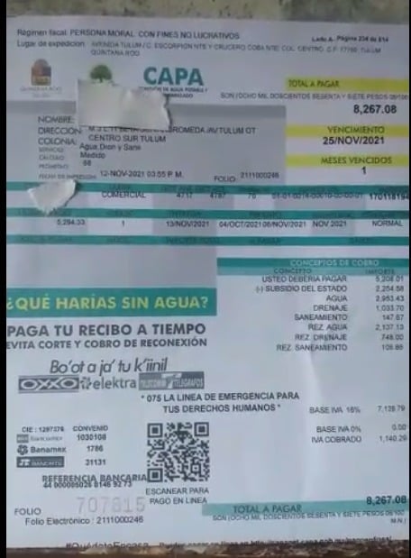 Tulum.- Ciudadanos de este municipio han comenzado a recibir por segunda ocasión en noviembre recibos de la Comisión de Agua Potable y Alcantarillado (CAPA), algunos por cobros que señalan son muy elevados.