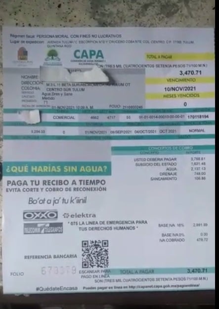 Un comerciante de la avenida Tulum señaló que siempre tenían como fecha de vencimiento el 25 de cada mes, pero a inicios de mes recibió un la boleta de cobro de CAPA, con fecha límite el 10 de noviembre, por 3 mil 470 pesos.