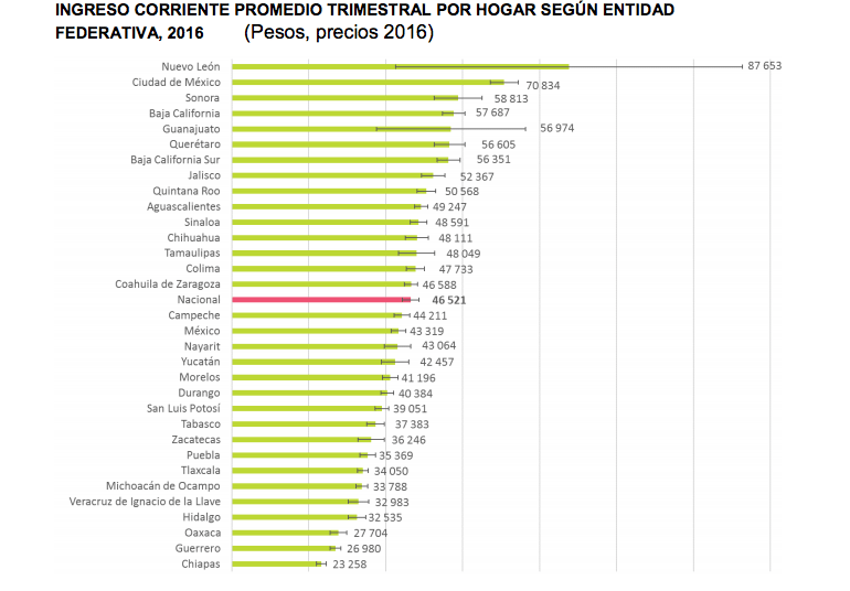 La ENIGH (Encuesta Nacional de Ingresos y Gastos de los Hogares) 2016 indica que, por entidad federativa, Nuevo León y Ciudad de México presentaron el mayor ingreso corriente promedio trimestral por hogar.
