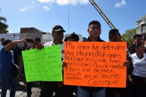 Varios elementos sacaron cartulinas en la que dicen estar en la indefensión por el caso de Héctor Casique, hombre que fue torturado por la entonces Procuraduría General del Estado, y por la que presuntamente existe cerca de una veintena de órdenes de aprehensión contra integrantes de este organismo.