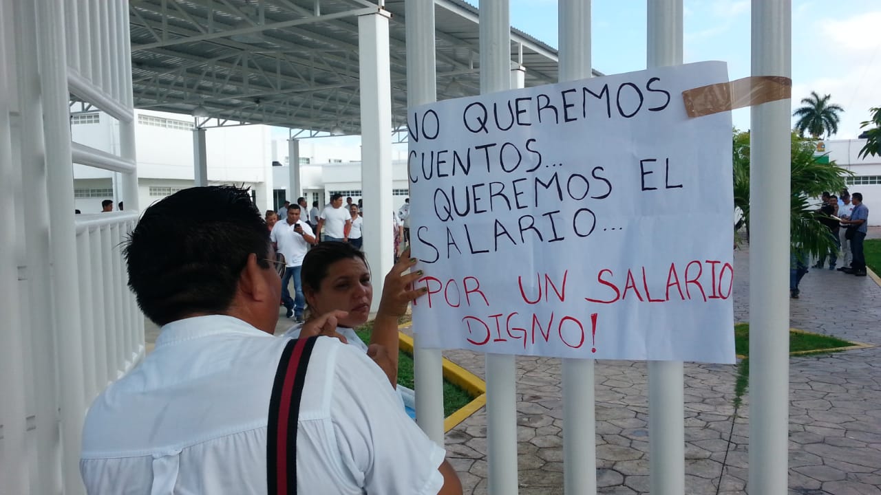 En la capital del estado, un grupo de ministeriales, en uniforme, se agolpó en la entrada principal de las instalaciones de la Fiscalía, donde colocaron una cartulina en la que piden un “salario digno” y no más descuentos.