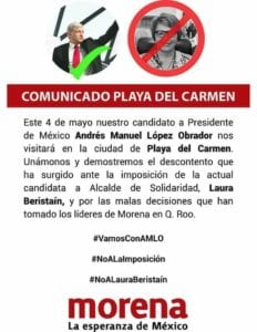 Playa del Carmen.- Teresa Sonia López Cardiel, suplente de Laura Beristain Navarrete en el Congreso, convocó a simpatizantes y militantes de Morena para exhortarlos a que durante la visita de AMLO transcurra en calma este viernes, pues tienen miedo que los diversos conflictos internos -en particular por nombrar candidata a la alcaldía a Laura Beristain Navarrete- empañen el arribo del candidato presidencial a la entidad.