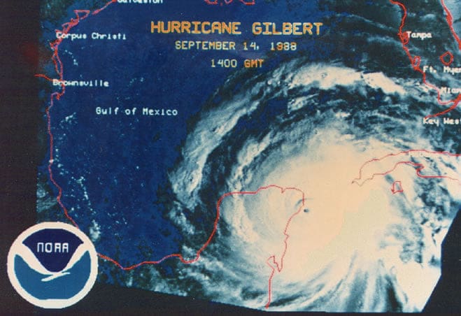 “Gilberto” tuvo vientos que superaron los 300 km/h y provocó en algunas zonas oleajes mayores a tres metros de altura, nacido a las 20:30 horas del 10 de septiembre de 1988 a unos 200 kilómetros al sur de Puerto Rico; previamente desarrollado desde el 3 de septiembre, cerca de las costas de África, en el Atlántico.