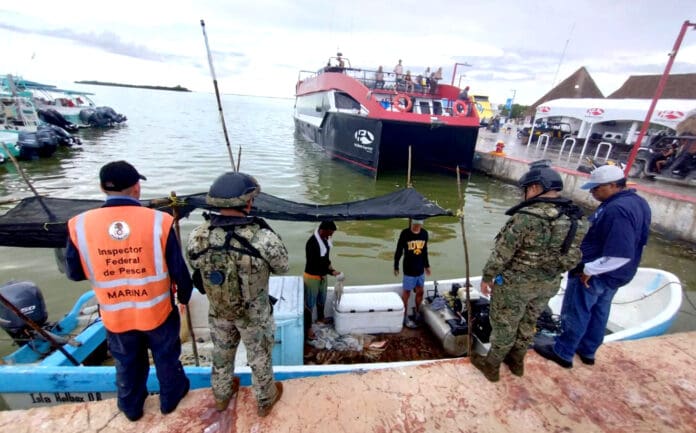 CANCÚN, 21 de agosto de 2024.- El personal de la Novena Región Naval confiscó una embarcación menor y su cargamento de langosta, y en otro hecho realizó la evacuación médica de una pasajera de un crucero turístico frente a las costas de Isla Mujeres.