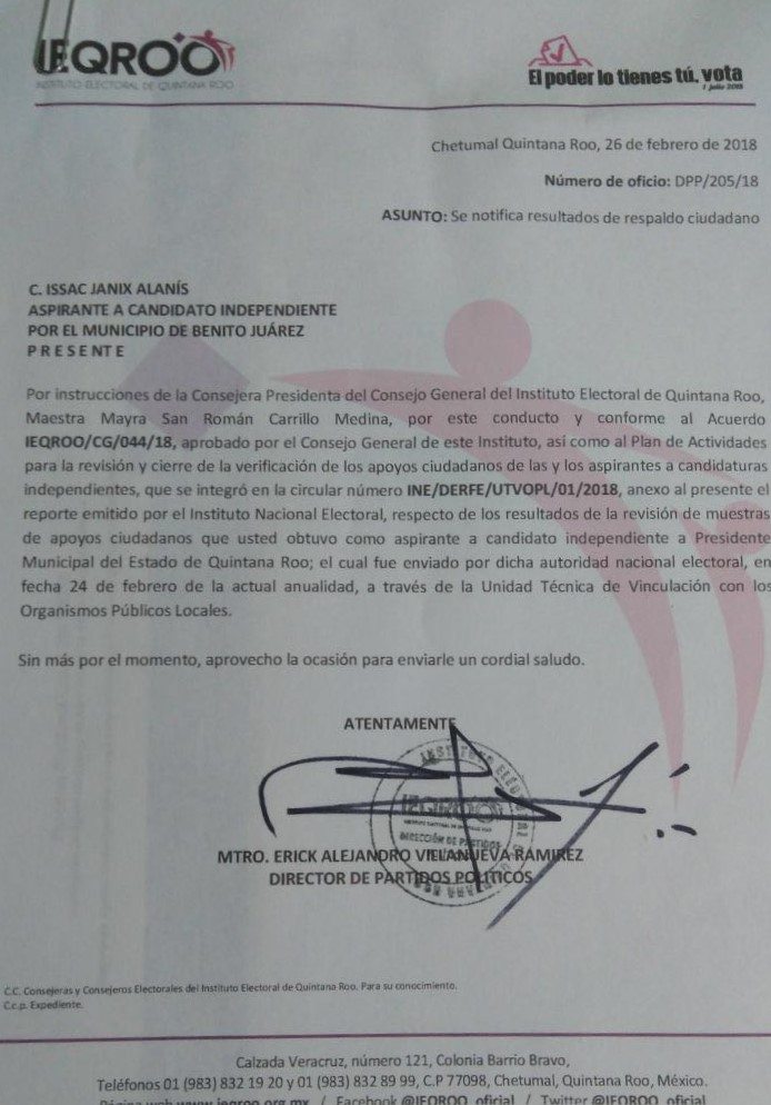 De acuerdo con el reporte del Instituto Electoral de Quintana Roo (Ieqroo), con cierre de 3 de febrero a las 23:59 horas, Janix Alanís suma 8 mil 670, justo por encima de las 8 mil 400 que pide la autoridad electoral y a tres días del fin del periodo de recolección de apoyos.