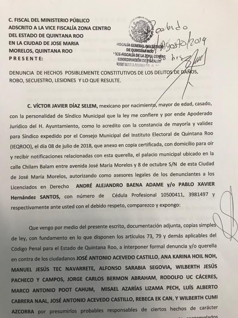 José María Morelos.- El síndico del Ayuntamiento de José María Morelos, Víctor Díaz Selem, interpuso una denuncia penal en contra de 13 trabajadores municipales, al acusarlos de daños, secuestro, robo y lesiones, por la manifestación que hicieron dentro del Palacio Municipal hace dos semanas, en exigencia de su quincena.