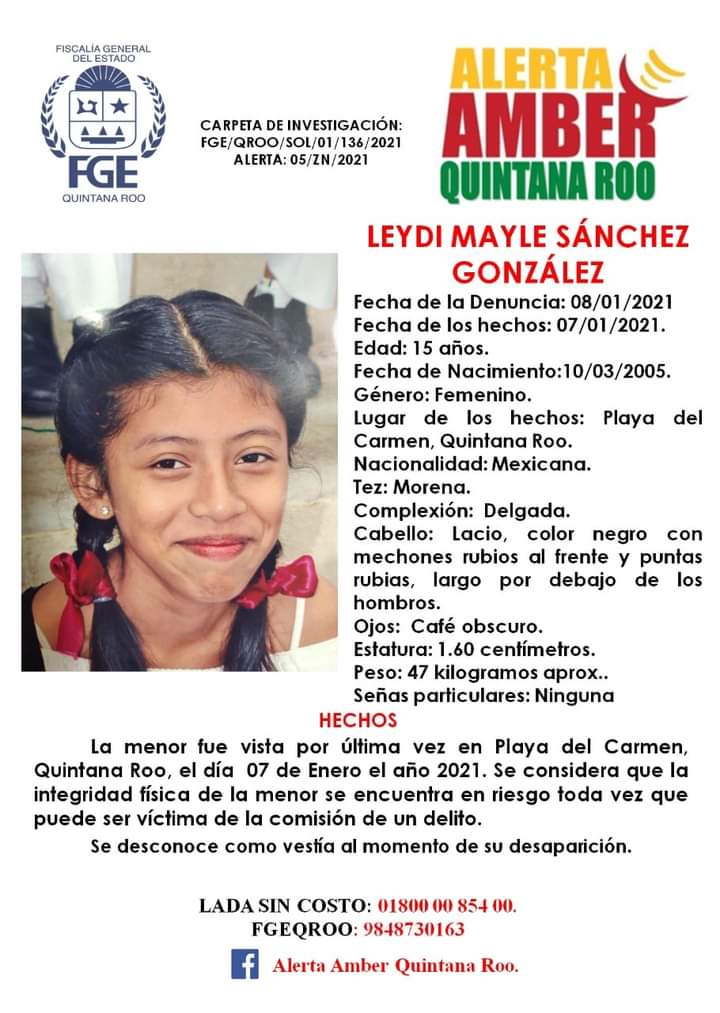 ¡Atención! Cuerpos de seguridad de la Fiscalía General Del Estado (FGE), activan la alerta Amber para localizar con vida a Leydi Mayle Sánchez González, una joven de 15 años, de tonalidad morena, desaparecida en día 7 de enero de 2021, vista por última vez en Playa del Carmen, se desconocen como vestía al momento de su desaparición.