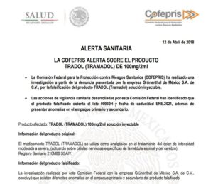 Cancún.- Autoridades mexicanas emitieron una alerta por la falsificación del medicamento Tramadol (Tradol), por lo que se pide a la ciudadanía a tener cuidado con la sustancia inyectable derivada de opiáceos.