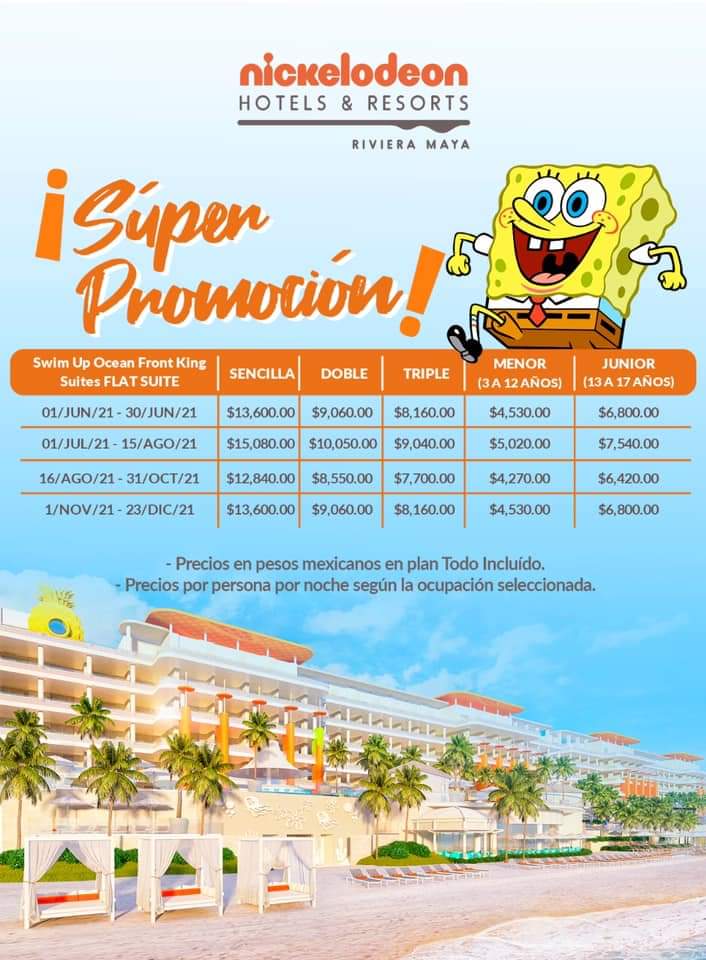 Del 16 de agosto al 31 de octubre los de 3 a 12 años pagarán en habitación por noche, 4 mil 270 pesos y los de 13 a 17, 6 mil 420 pesos. Mientras que del 1 de noviembre al 23 de diciembre, los primeros pagarán 4 mil 530 pesos y los segundos 6 mil 800 pesos.