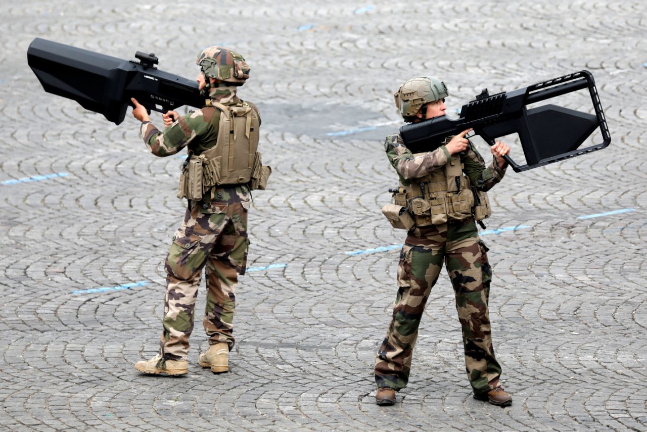 Soldados del ejército francés sostienen armas antidrones durante el tradicional desfile militar del Día de la Bastilla en la Avenida de los Campos Elíseos de París el 14 de julio. (Foto: Charles Plaiau / Reuters).