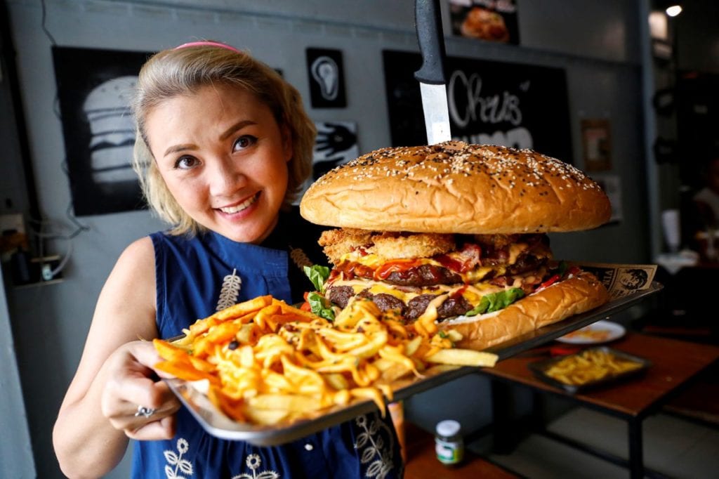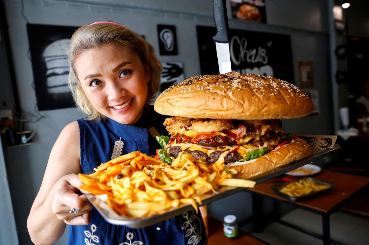 Una mujer levanta la que, según el restaurante de Bangkok Chris Steaks & Burgers, es la hamburguesa más grande de Tailandia con un peso de 6 kilos. Fotografía del 11 de octubre. (Foto: Jiraporn Kuhakan / Reuters).