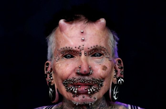El alemán Rolf Buchholz, que asegura ser la persona que más piercings tiene del mundo con 480, posa durante la Convención Internacional de Tatuajes de Bruselas (Bélgica) el 8 de noviembre. (Foto: Yves Herman / Reuters).