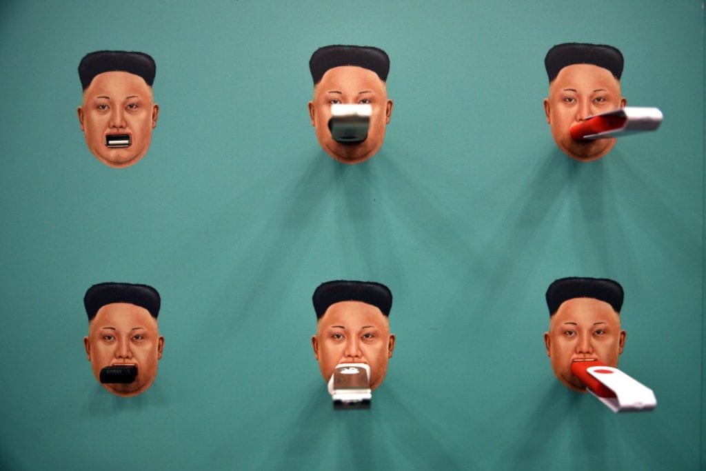 Un stand de conectores USB con caras de Kim Jong-un que se vio en el evento anual South by Southwest de Austin, Texas (Estados Unidos), el 11 de marzo.