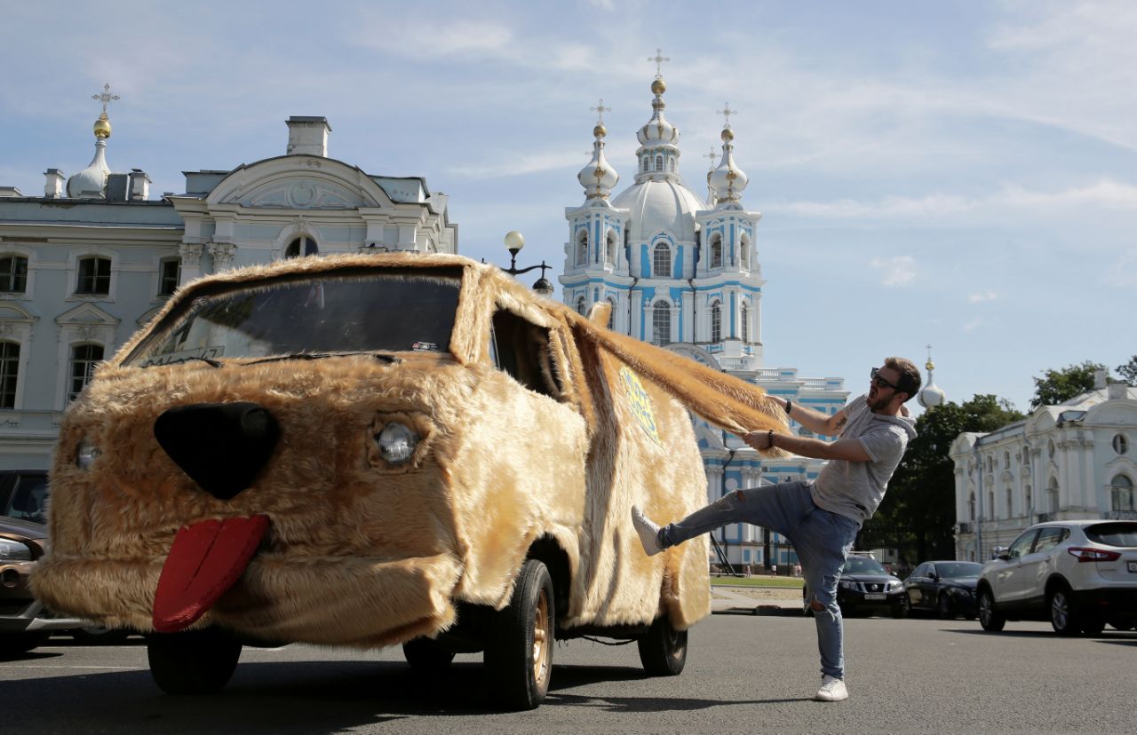 El blogger y actor ruso Roman Pritula posa con su Dogmobile, un vehículo que creó a partir de una Volkswagen antigua, cerca de la Catedral Smolny de San Petersburgo (Rusia) el 25 de julio. (Foto: Anton Vaganov / Reuters).