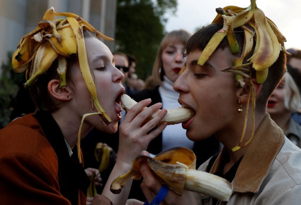 Varias personas comen plátanos frente al Museo Nacional de Varsovia (Polonia) el 29 de abril en señal de protesta después de que el centro retirara una obra que fue calificada de obscena. (Foto: Kacper Pempel / Reuters).