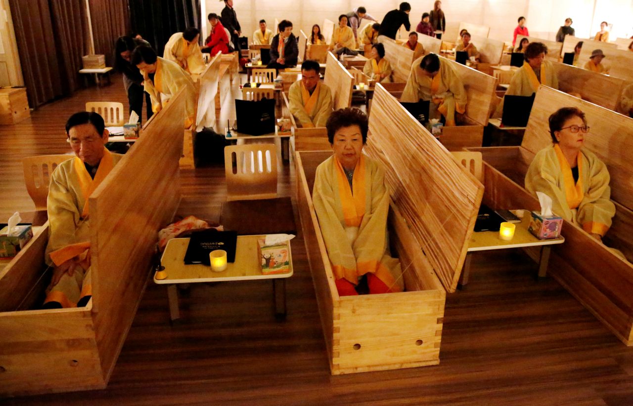 Varias personas se sientan dentro de unos ataúdes durante una de las actividades de un programa que enseña a “morir bien” en Seúl (Corea del Sur) el 31 de octubre. (Foto: Heo Ran / Reuters).