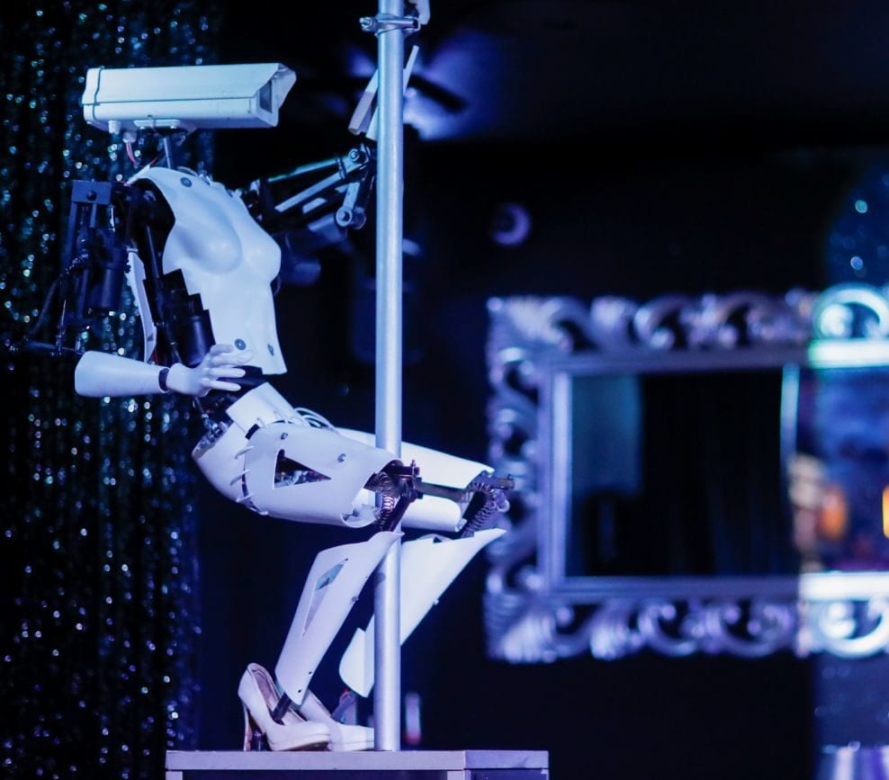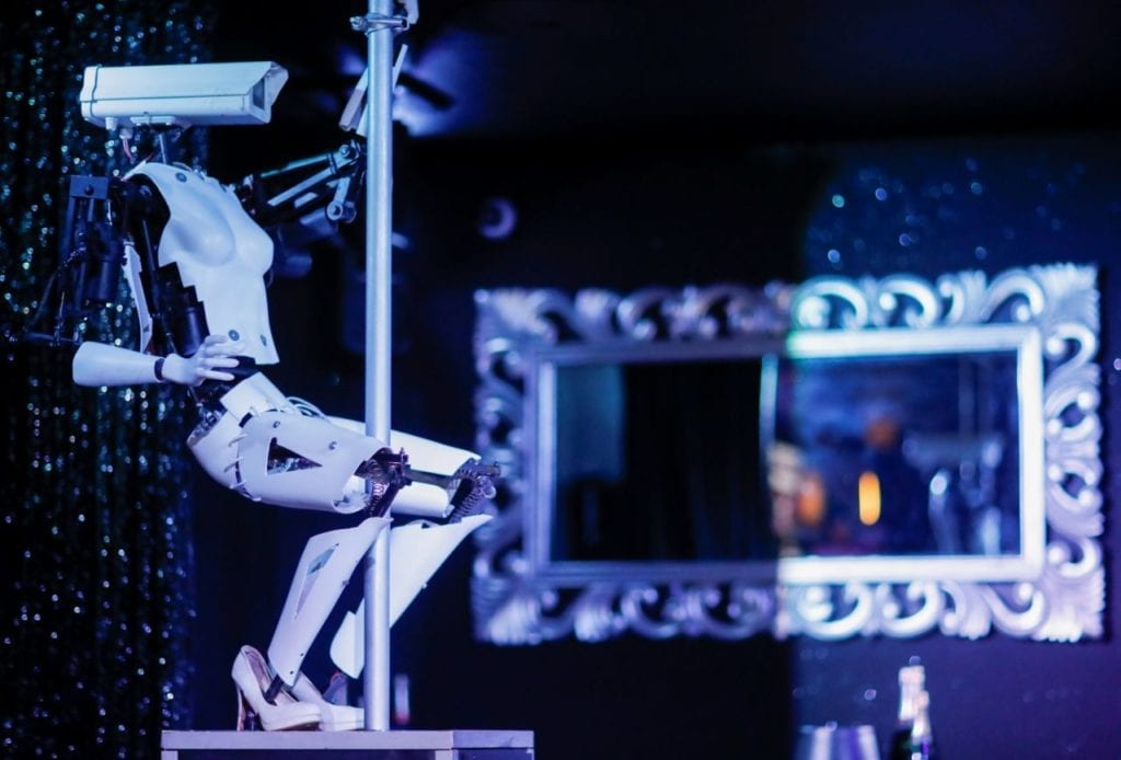 Un robot creado por el artista británico Giles Walker hace pole dance en el Strip Club Café de Nantes (Francia) el 29 de agosto. (Foto: Stephane Mahe / Reuters).