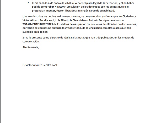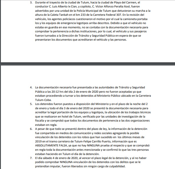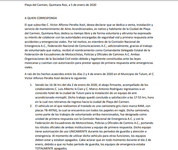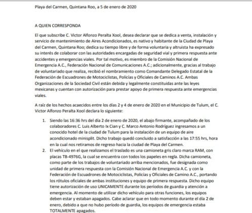 Sin embargo, Víctor Alfoso Peralta Xool, delegado de la asociación civil Federación de Escuadrones de Motociclistas, Policías y Oficiales de Camino, explicó en un comunicado que estaban en esa carretera pues regresaban de reparar un aire acondicionado en un hotel, actividad económica a la que se dedica, y que tenían el equipo de emergencia apagado.