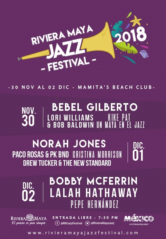 Playa del Carmen, Quintana Roo.-  Los máximos exponentes del jazz internacional se presentarán en un mismo escenario del 30 de noviembre al 2 de diciembre, días en que deleitarán a su público al ritmo de los swings rodeados de la belleza del Caribe Mexicano en la 16ª edición del Riviera Maya Jazz Festival 2018, en un evento totalmente gratuito.