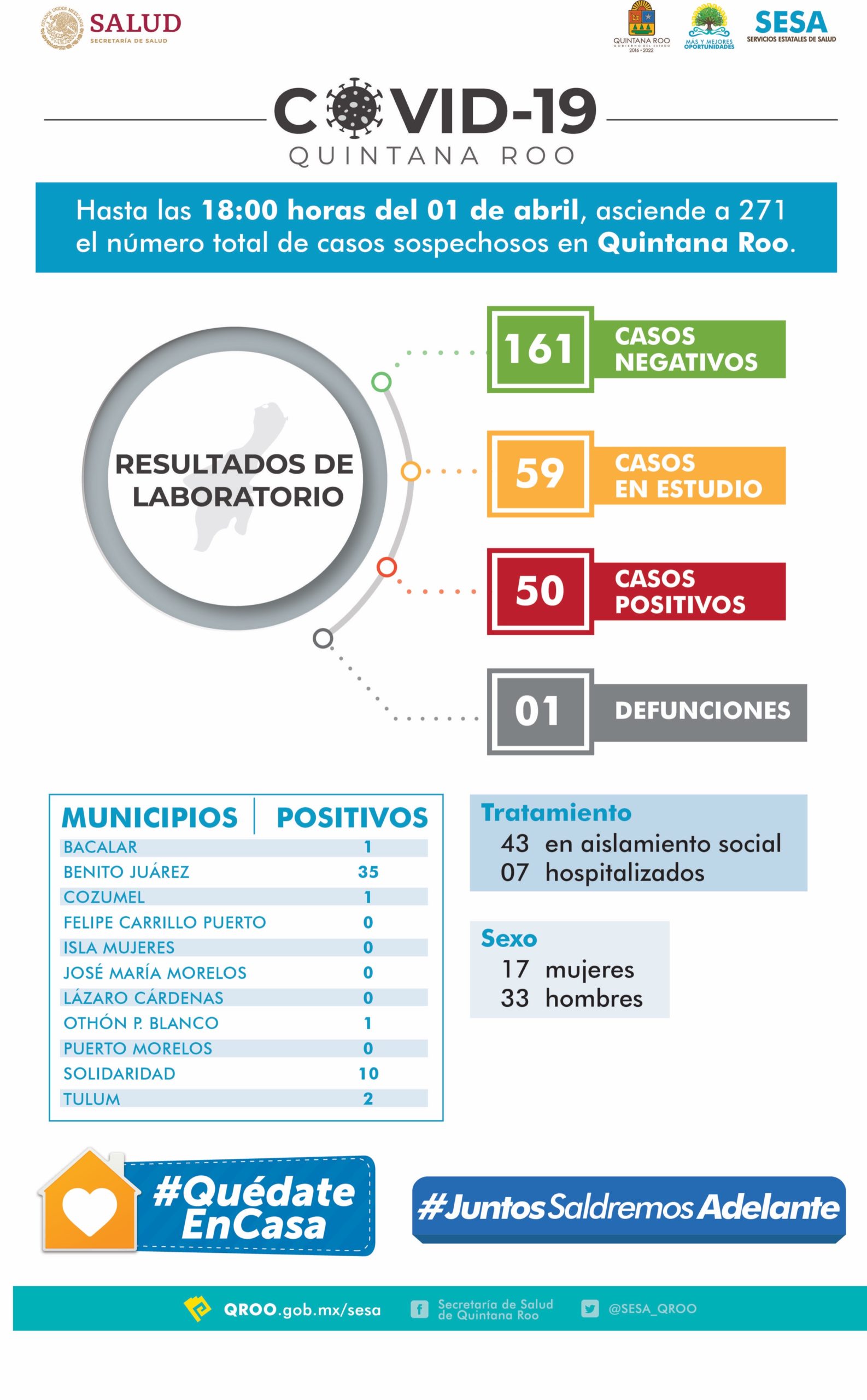 En el corte diario que en redes sociales informa la secretaria de Salud, Alejandra Aguirre Crespo, se tiene que hasta las 18 horas de hoy miércoles, se han detectado 271 casos sospechosos de coronavirus COVID-19 en la entidad, de los que 161 fueron descartados, 59 están en estudio y 50 dieron positivos, además de contabilizarse la defunción ocurrida en Cancún.