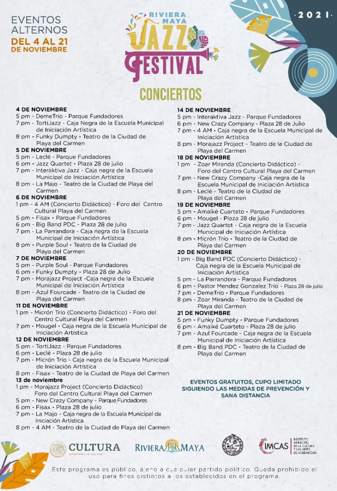 Habrá además de actividades alternas de 20 agrupaciones locales, que se celebrarán en cincos sedes de Playa del Carmen: Teatro de la Ciudad, Parque Fundadores, Plaza 28 de julio, Escuela Municipal de Iniciación Artística y el foro del Centro Cultural.