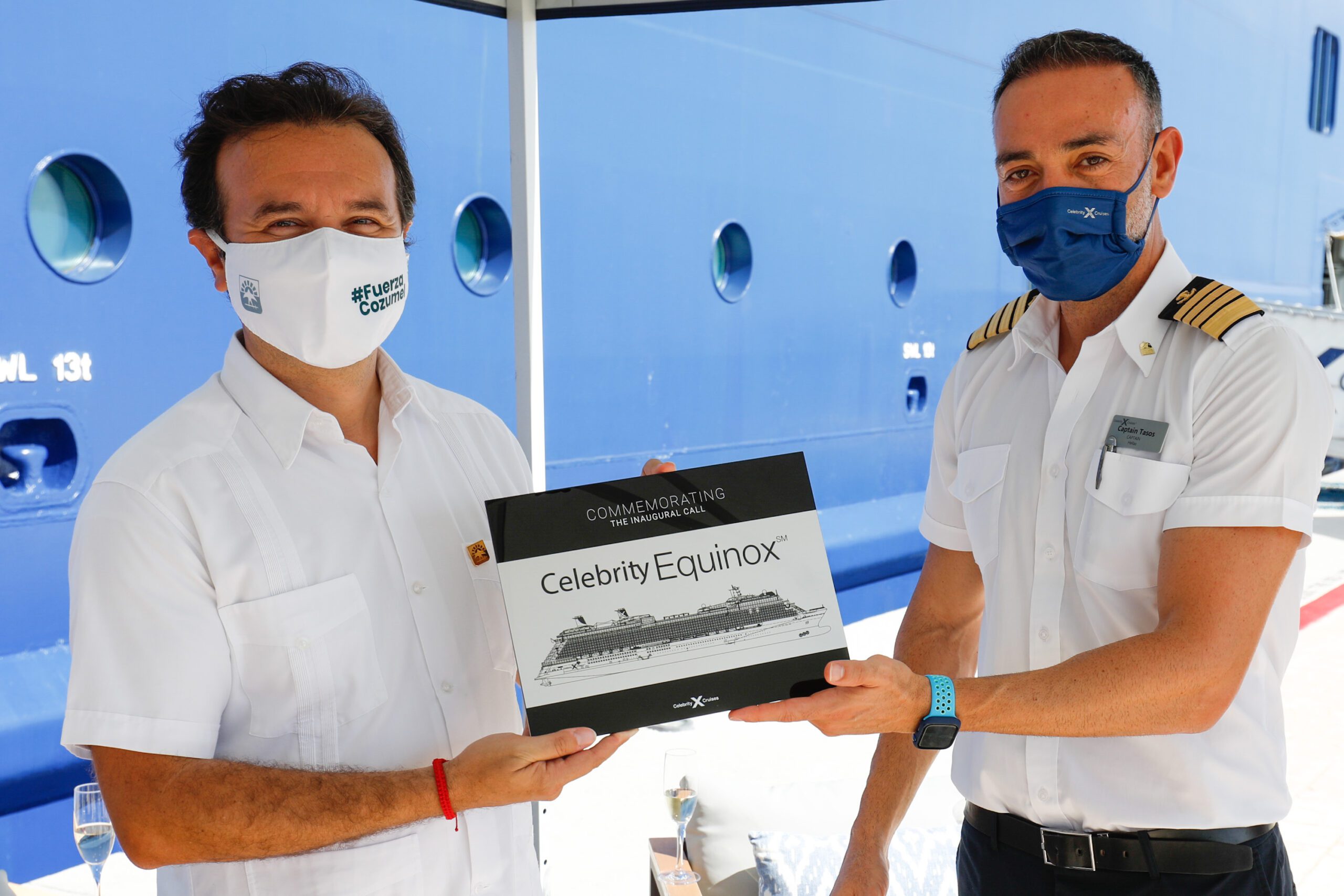 Durante el evento de bienvenida, el Presidente Municipal intercambió placas de arribo con el capitán del Celebrity Equinox, Anastasios Kafetzis, acto en el que estuvieron presentes, por parte del navío, el Jefe de Ingeniería, Loannis Fragkoulis; Hotel Director, Daniel Hutchinson y el Jefe de Recursos Humanos Manolo Cerrud.