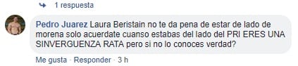 “Laura Beristain estas en la lista de las ratas no te da pena sólo acuérdate cuando estabas del lado del PRI eres una sinvergüenza rata”.