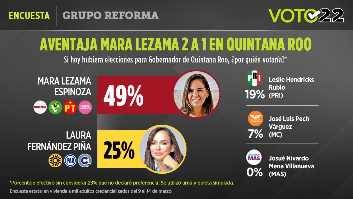 Con un amplio 49 por ciento de las preferencias es que Mara Lezama aparece en el primer lugar de esta encuesta de Reforma, dejando al segundo lugar con un lejano 25 por ciento. En este caso Laura Fernández Piña, la abanderada de PAN, PRD y Confianza por Quintana Roo.
