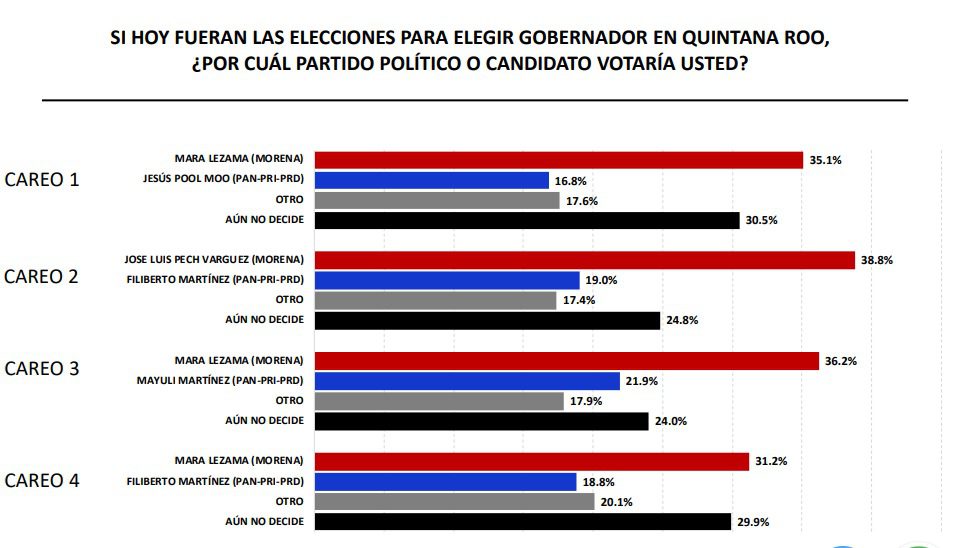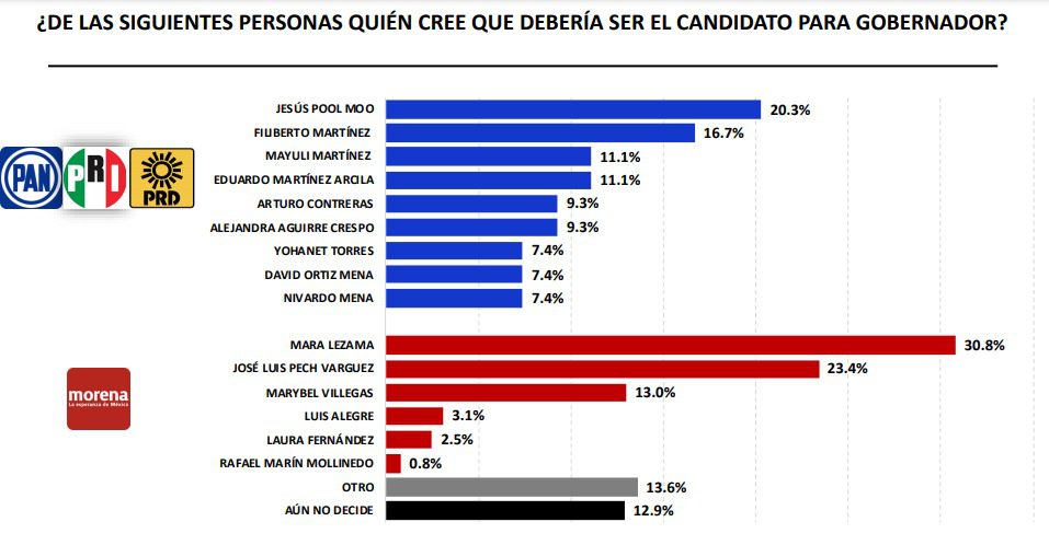 En cuanto a quién gustarían de candidatos, por el lado de Morena, un 30.8% se decantó por Mara Lezama Espinosa, un 23.4% por el senador José Luis Pech Várguez, un 13% por la senadora Marybel Villegas Canché, un 3.1% por el diputado Luis Alegre Salazar, un 2.5% por la diputada electa Laura Fernández Piña y un 0.8% por Rafael Marín Mollinedo, ex delegado de Morena y actual coordinador del proyecto del Istmo de Tehuantepec.