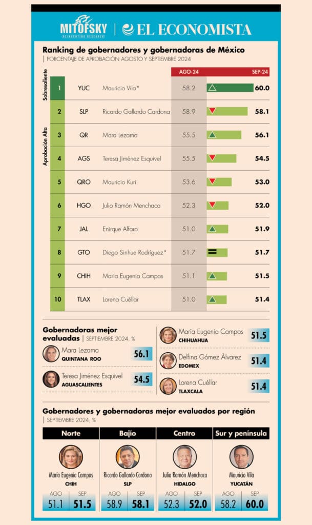 Junto a la gobernadora Mara Lezama, el top ten de mejores autoridades se completa con quienes están al frente de Yucatán, San Luis Potosí, Querétaro, Hidalgo, Jalisco, Guanajuato y de los estados anteriormente mencionados.