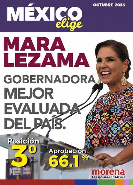 Además, resalta que Mara Lezama subió tres lugares respecto a la medición anterior. Y es además la autoridad estatal mejor evaluada del partido Morena, ya que los dos primeros lugares corresponden al PAN y al Partido Verde.