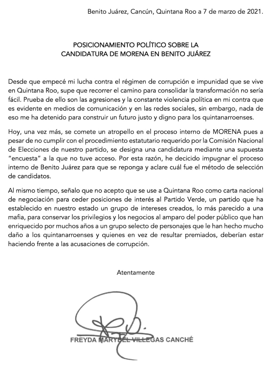 Denunció que el Movimiento Regeneración Nacional (Morena) cometió un atropello al designar una candidatura mediante una supuesta encuesta a la que no ella tuvo acceso”, señala en una parte del documento. Y advierte: “Por esta razón, he decidido impugnar el proceso interno de Benito Juárez (Cancún) para que se reponga y aclare cuál fue el método de selección de candidatos”.