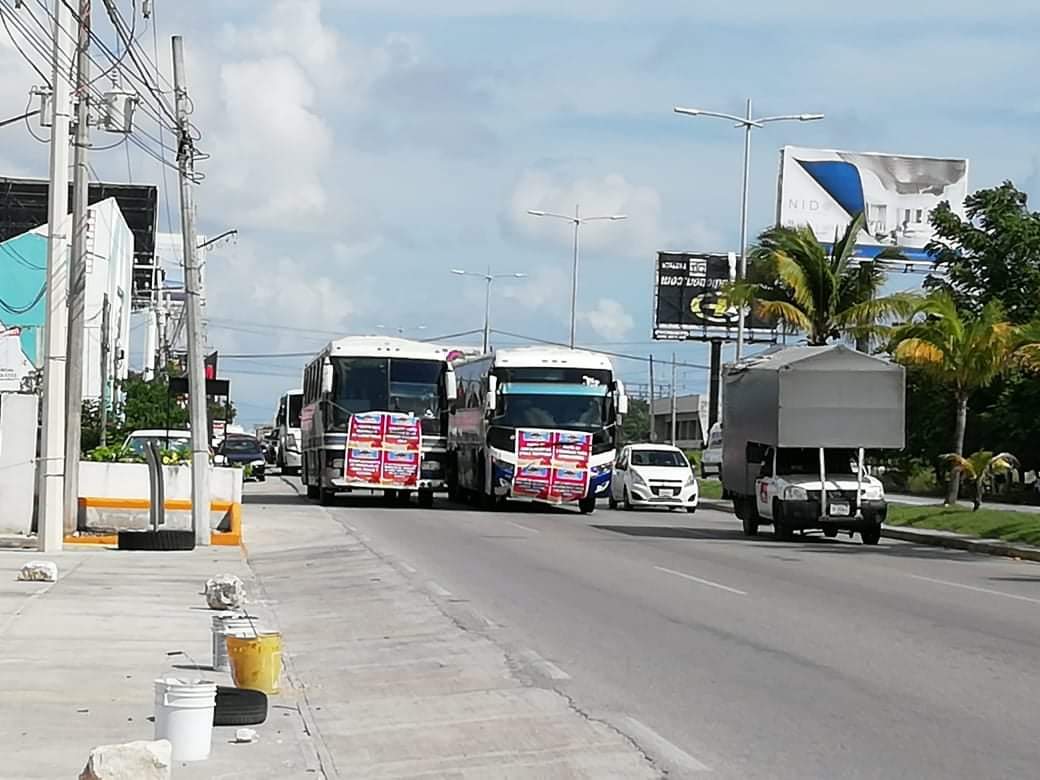 Cancún.- Como parte del paro nacional convocado por la Alianza Mexicana de Organización de Transportistas A. C. (Amotac), una caravana de autobuses carcacha y camiones viejos de hace treinta años circularon esta mañana por el bulevar Colosio, rumbo al Aeropuerto Internacional de Cancún, lo que generó un fuerte embotellamiento en las calles de la ciudad.