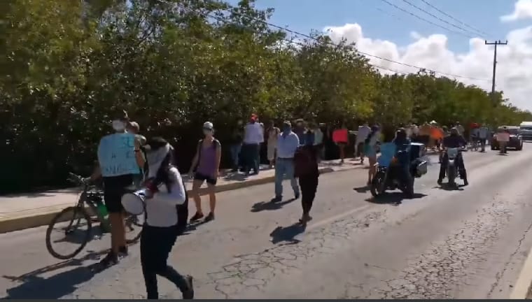 Puerto Morelos.- Un grupo de ciudadanos marchó de manera pacífica por las calles de esta cabecera municipal para expresar su rechazo a la actual remodelación del parque del Casco Antiguo.