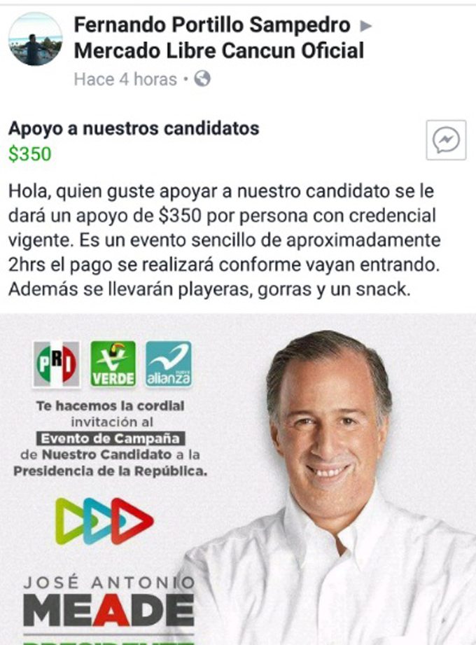 Dentro de la gira de campaña por el estadoMeade Kuribreña visitará Playa del Carmen y Cancún, en el cual ya se ofrece la cantidad de 350 pesos por asistir al próximo evento a través de redes sociales, así lo dio a conocer un usuario en el grupo de Facebook “Mercado Libre Cancun Oficial” (sic), donde se menciona habra playeras gorras y un snack.