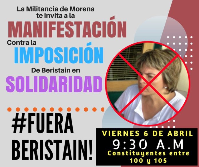 Solidaridad.-La militancia de Movimiento de Regeneración Nacional (Morena) se organiza través de las redes sociales ante el descontento por imposiciones al interior del partido, está circulado una imagen que invita a todos a participar en una marcha contra Laura Beristain Navarrete programada para el día de mañana, viernes 6 de abril a las 9:30 am, en la avenida Constituyentes, entre calle 100 y 105.