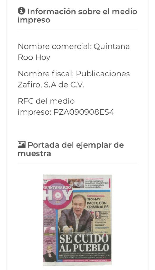 Pero el fraude es evidente y está a la vista de todos, en el Padrón Nacional de Medios Impresos, de consulta pública, en donde el Quintana Roo Hoy figura bajo el expediente CCPRI/3/TC/16/20583, y con su nombre fiscal Publicaciones Zafiro. Allí, su representante legal, Aurora Olin Godoy, presentó la certificación de circulación, ¡del Tabasco Hoy!, cómo si se tratara del periódico quintanarroense.