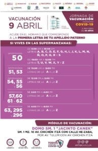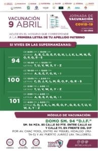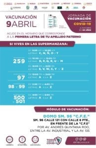 Igual hay un módulo de vacunación en el domo de la Supermanzana 94, en la manzana 85 calle 50 poniente entre la 44 y 111, enfrente del DIF, por Avenida Chac Mool, entre Avenida Miguel Hidalgo (Ruta-5) y Avenida Puerto Juárez (Avenida Talleres).