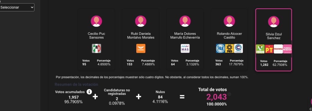 Silvia Dzul está arrasando en el Noveno Distrito con sede en Tulum. Aparece con un 62.75 por ciento. El segundo lugar suma el 17.76 por ciento. Por lo que se puede afirmar que llegará al Congreso de Quintana Roo.