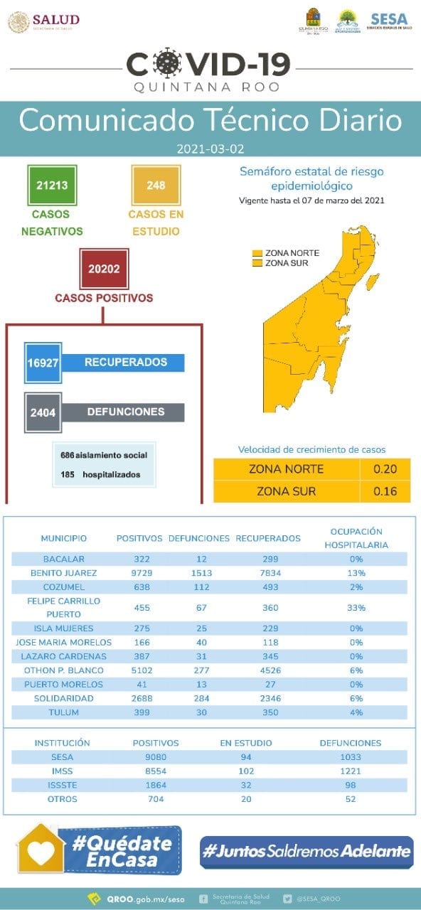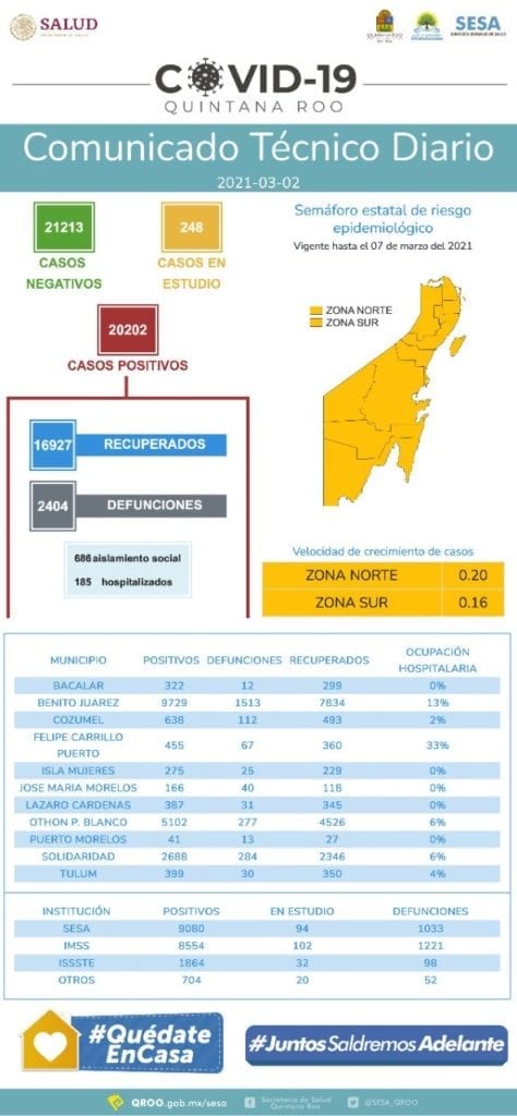 Quintana Roo.- Hasta el 02 de marzo de 2021, se han notificado 2 mil 404 defunciones y 20 mil 202 casos positivos a COVID-19.