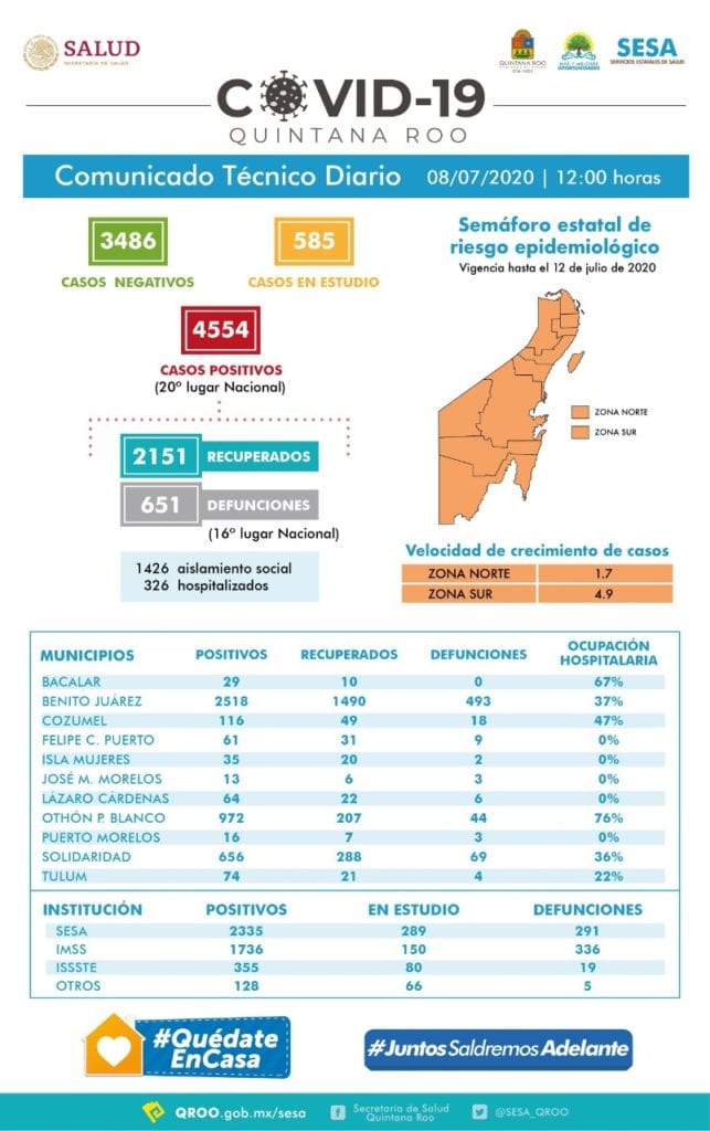 Como se mencionó, 10 de las defunciones de hoy corresponden a Benito Juárez, que suma 493 víctimas, dos son de Solidaridad, dos de Felipe Carrillo Puerto y una de Cozumel.
