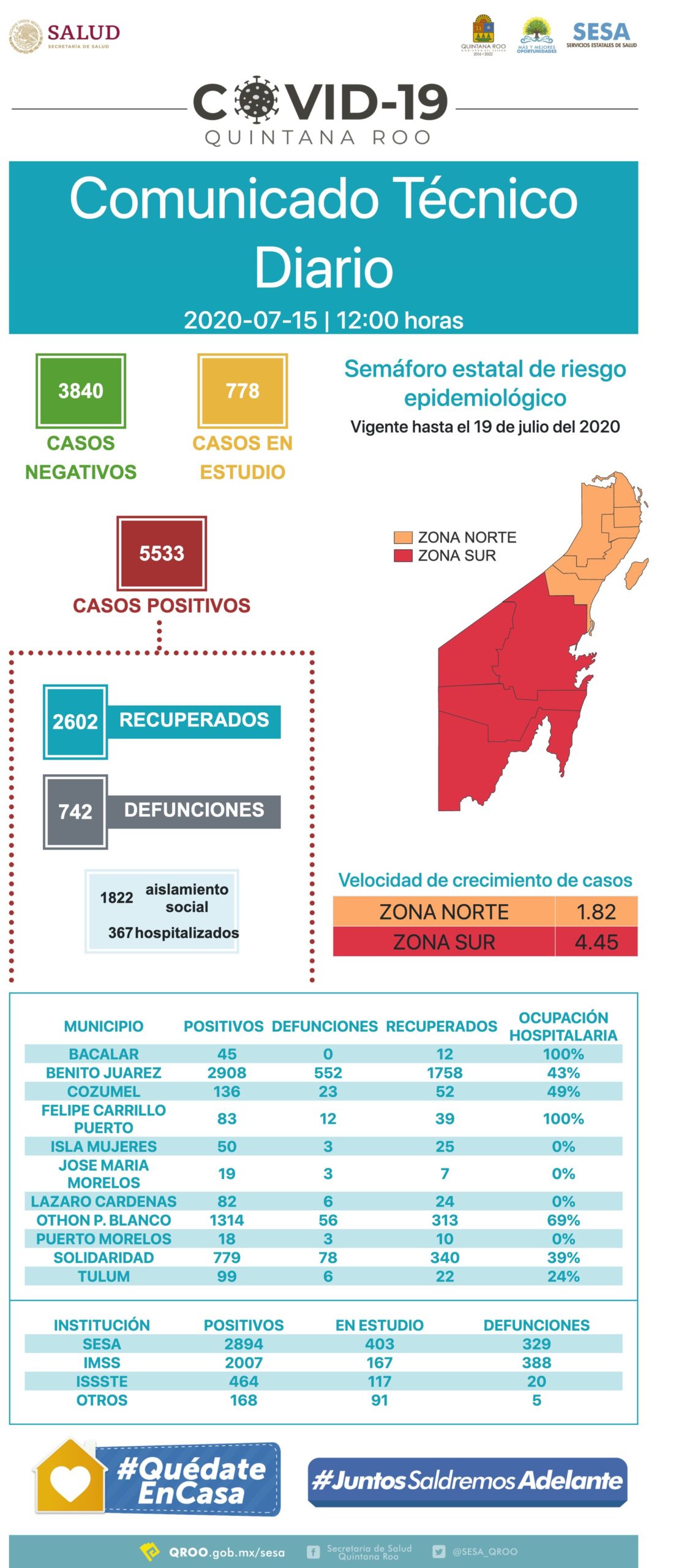 De acuerdo al último corte de la Secretaría Estatal de Salud, a la fecha se tienen 5 mil 533 casos confirmados de COVID-19 en Quintana Roo, de los que 742 han fallecido, 367 están hospitalizados, mil 822 están en aislamiento social y 2 mil 602 ya se han recuperado.