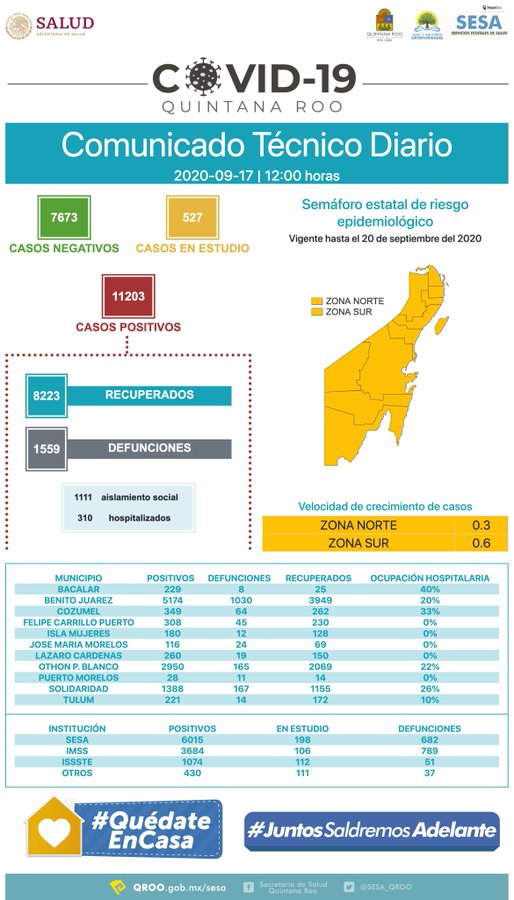 En tanto, 12 de los 15 casos nuevos de hoy son de Othón P. Blanco, municipio que actualmente tiene cerca de la mitad de los casos activos en la entidad.