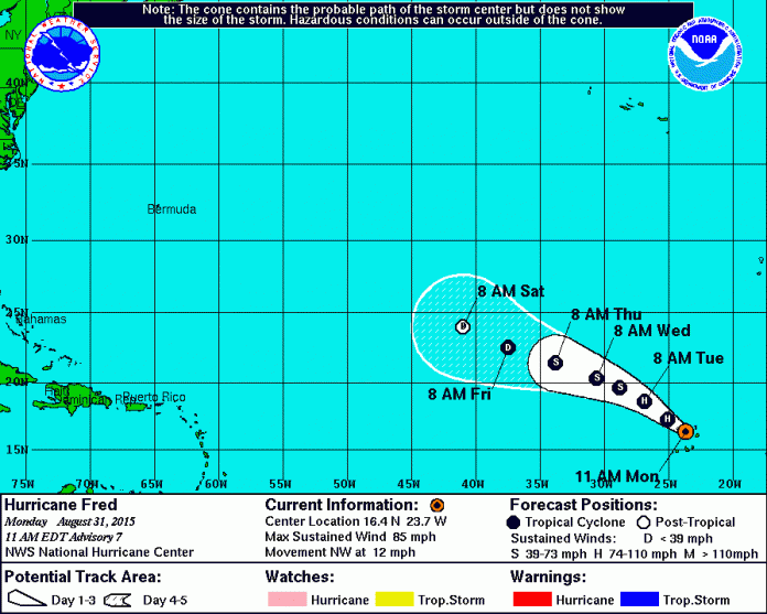 Fred está a unas 60 millas al sur-sureste de Rabil, en Cabo Verde, y se mueve en dirección noroeste a cerca de 12 mph.