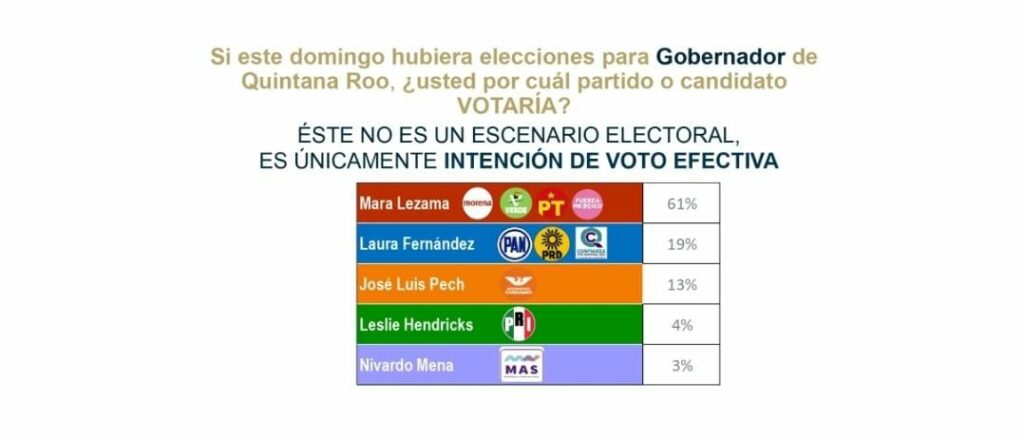 En este sondeo que fue levantado entre finales de abril y principios de mayo Mara Lezama Espinosa aparece con un 61 por ciento de preferencias. En un lejano segundo lugar está la abanderada de PAN, PRD y Confianza por Quintana Roo con un 19 por ciento.