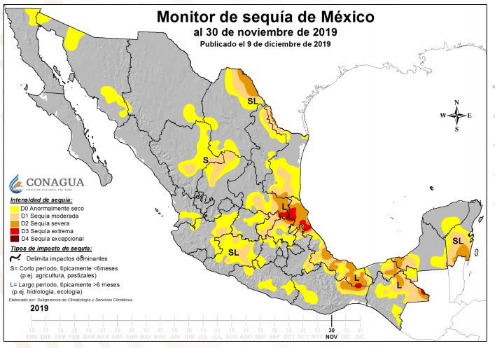 De acuerdo al Monitor de Sequía en México, perteneciente al Servicio Meteorológico Nacional, el clima seco persistió prácticamente todo el año en la entidad, aunque en categoría de severo solo a partir de mayo. La falta de lluvias arruinaron múltiples cosechas en la entidad, confirmó en entrevista en fechas pasadas el secretario de Desarrollo Agropecuario, Rural y Pesca (Sedarpe), Luis Torres Llanes.